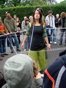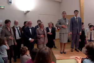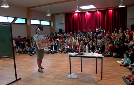 Enfin, l’arrivée de Melle Pilchard et de ses élèves est annoncée, et le public est en délire... Au programme de ces 18 stagiaires, la traduction de phrases extraites d’un « Manuel de Savoir-Vivre » mis à disposition de Bénédicte Pilchard par Michèle Bosseur, co-directrice du Fourneau, experte dans ce domaine de l’éducation.