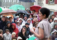 La Gouaille et la Diva entrent en scène, sur le parvis de l’église, il pleut.